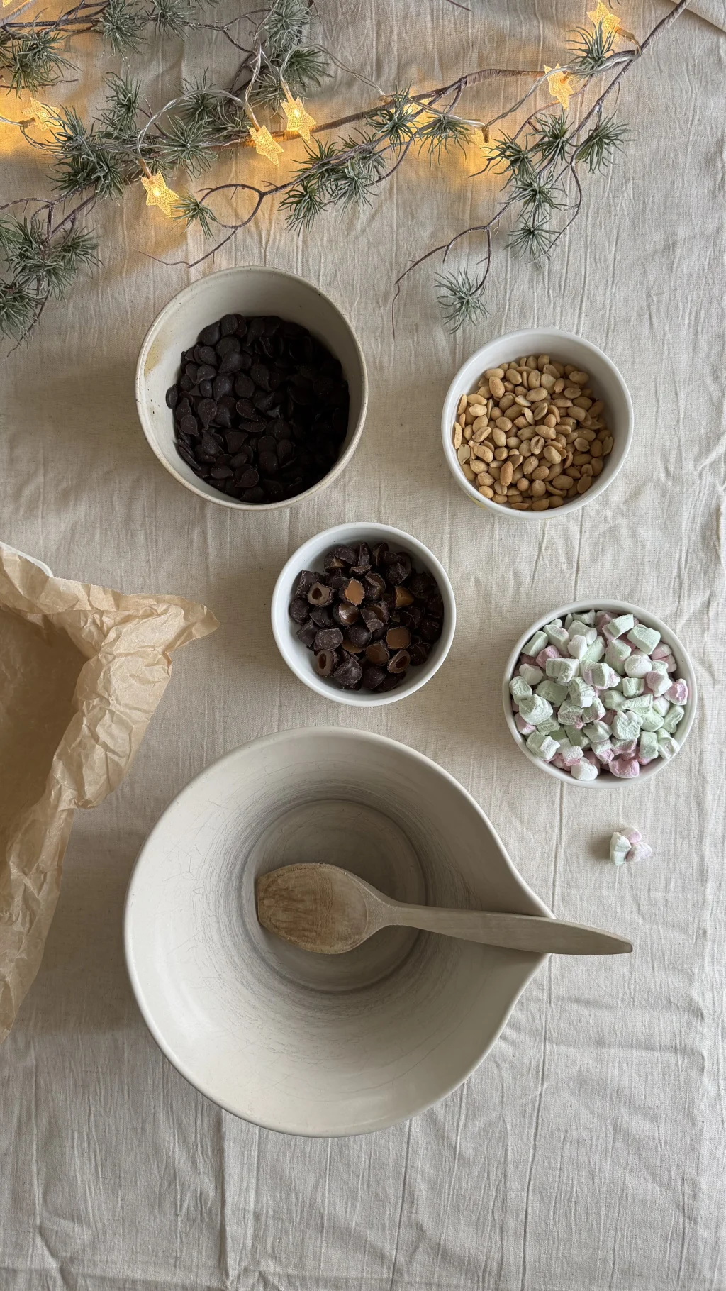 Hak mandler og karameller og klip juleskum i små bidder.